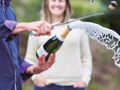 - Posicione a lâmina do sabre no início do gargalo da garrafa e com um golpe firme, porém não com força (para não quebrar a garrafa), deslize a lâmina em direção ao bico da garrafa, a qual se rompe, levando consigo a rolha.